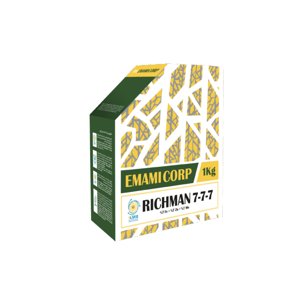 سه­ گانه منحصر به فرد ریچمن 7-7-7 با استفاده از آهن افزایش کلروفیل و سبزینگی، با استفاده از عنصر روی افزایش رشد و با استفاده از منگنز افزایش رنگ­ اندازی و سایز میوه را به همراه دارد. نسبت متوازن سه عنصر آهن، روی و منگنز علاوه بر رفع کمبود عناصر ریزمغذی در محصولات و درختان میوه مناطق گرم و خشک ایران بسیار شایع است، تشدید کمبود یکی از این سه عنصر به دلیل آنتاگونیسم را کاهش می­ دهد. ریچمن 7-7-7 منجر به کلروفیل، اسید آمینه تریپتوفان (پیش­ ساز ایندول استیک اسید) و فعال­سازی آنزیم ایندول استیک اسید اکسیداز می ­شود که مانع از ریزبرگی و ریزش زودهنگام میوه و برگ­ها شده و با افزایش فتوسنتز عملکرد نهایی را افزایش می­ دهد.